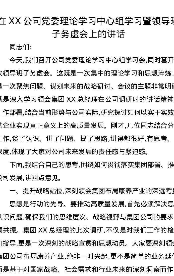 在XX公司党委理论学习中心组学习暨领导班子务虚会上的讲话