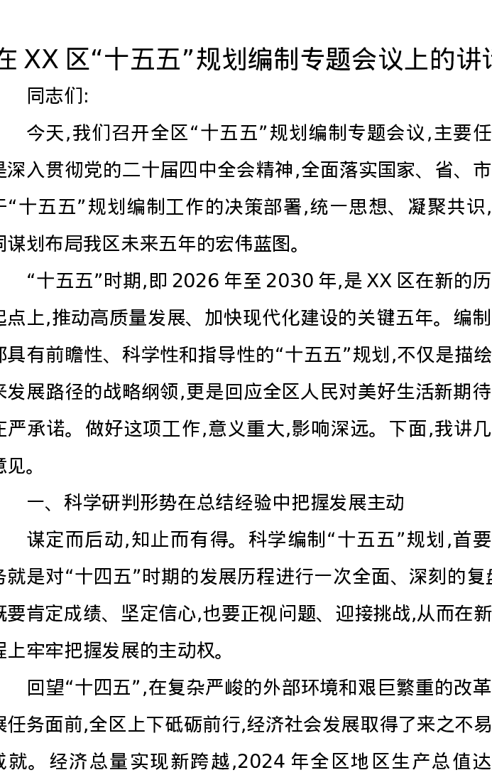在XX区“十五五”规划编制专题会议上的讲话