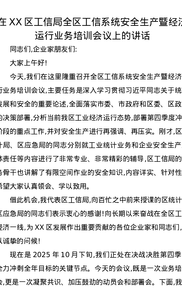 在XX区工信局全区工信系统安全生产暨经济运行业务培训会议上的讲话