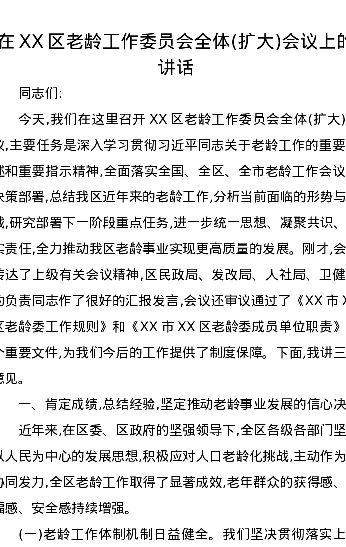 在XX区老龄工作委员会全体(扩大)会议上的讲话