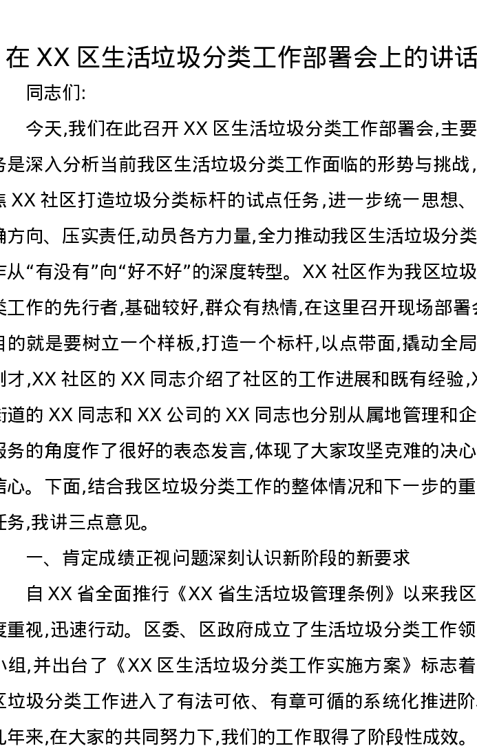 在XX区生活垃圾分类工作部署会上的讲话