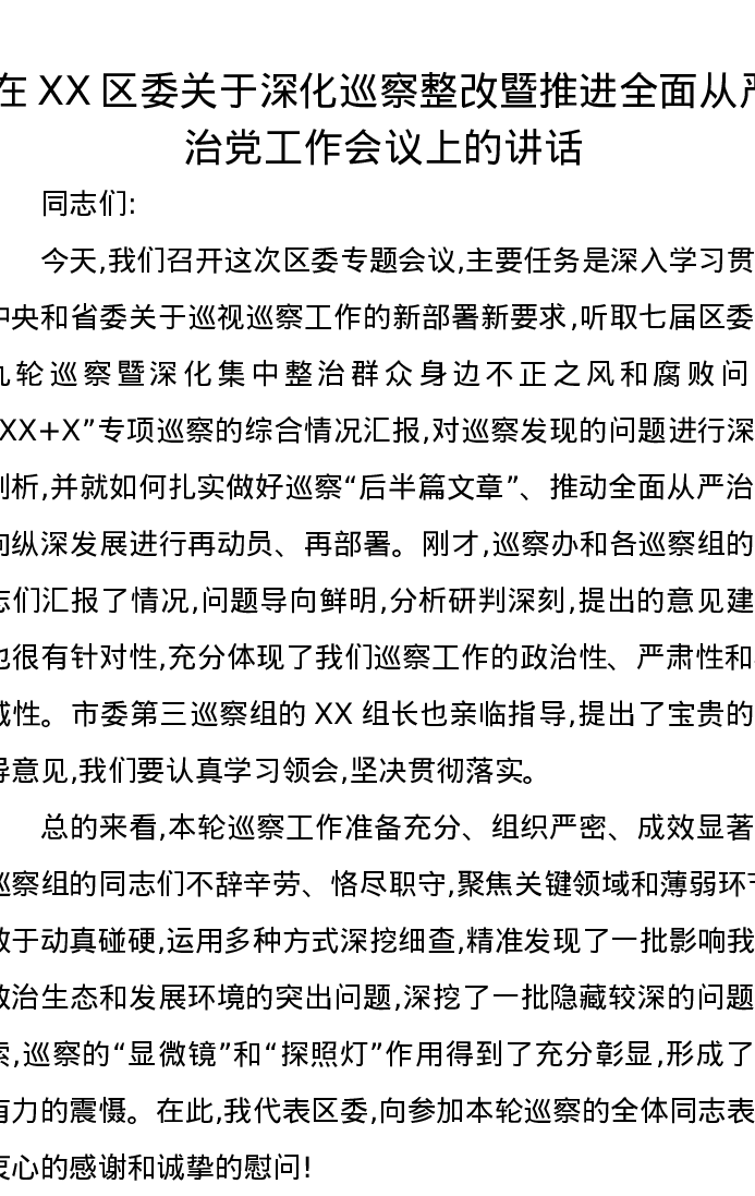 在XX区委关于深化巡察整改暨推进全面从严治党工作会议上的讲话