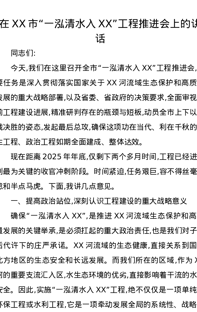 在XX市“一泓清水入XX”工程推进会上的讲话
