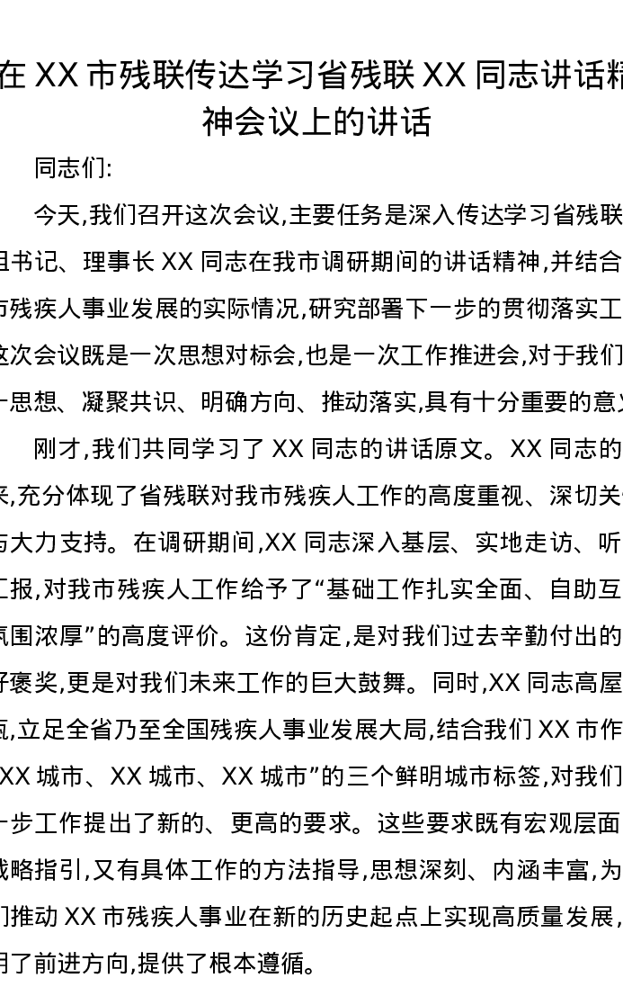 在XX市残联传达学习省残联XX同志讲话精神会议上的讲话