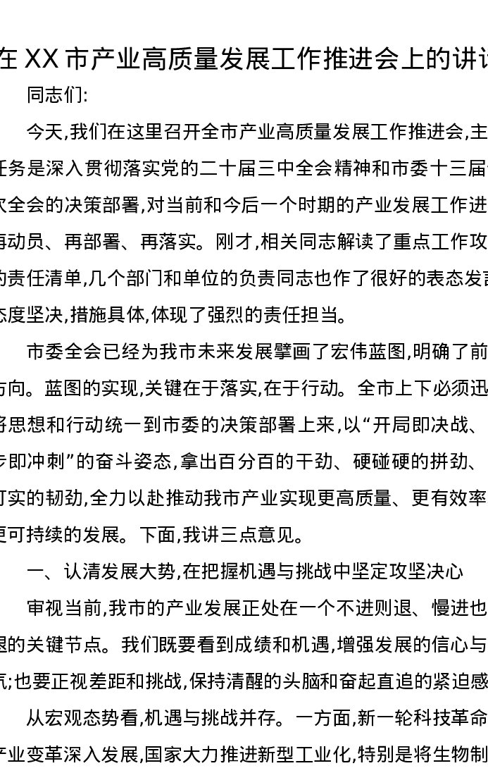 在XX市产业高质量发展工作推进会上的讲话