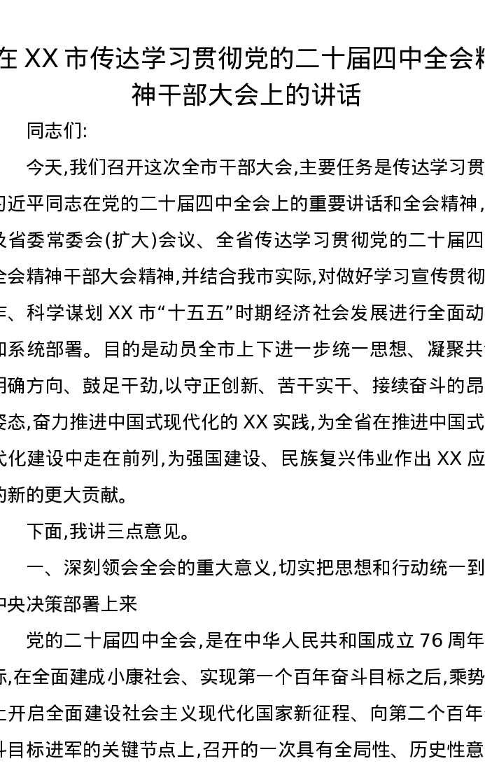在XX市传达学习贯彻党的二十届四中全会精神干部大会上的讲话