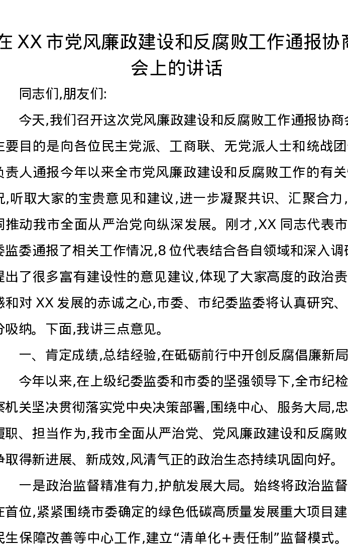 在XX市党风廉政建设和反腐败工作通报协商会上的讲话