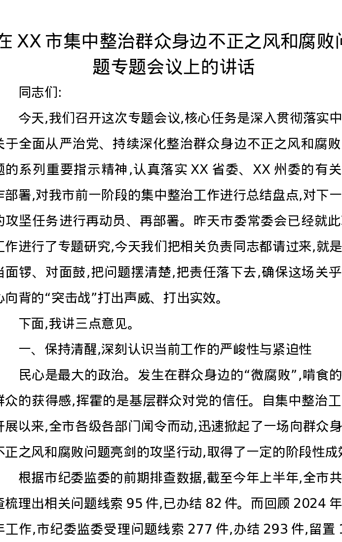 在XX市集中整治群众身边不正之风和腐败问题专题会议上的讲话