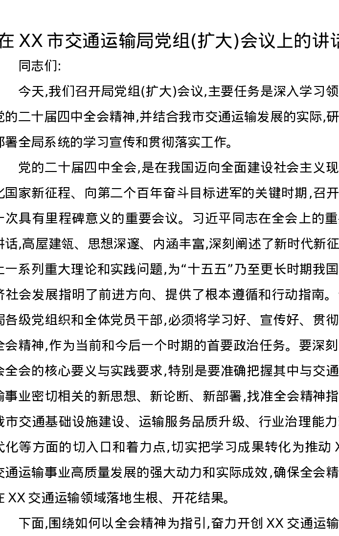 在XX市交通运输局党组(扩大)会议上的讲话