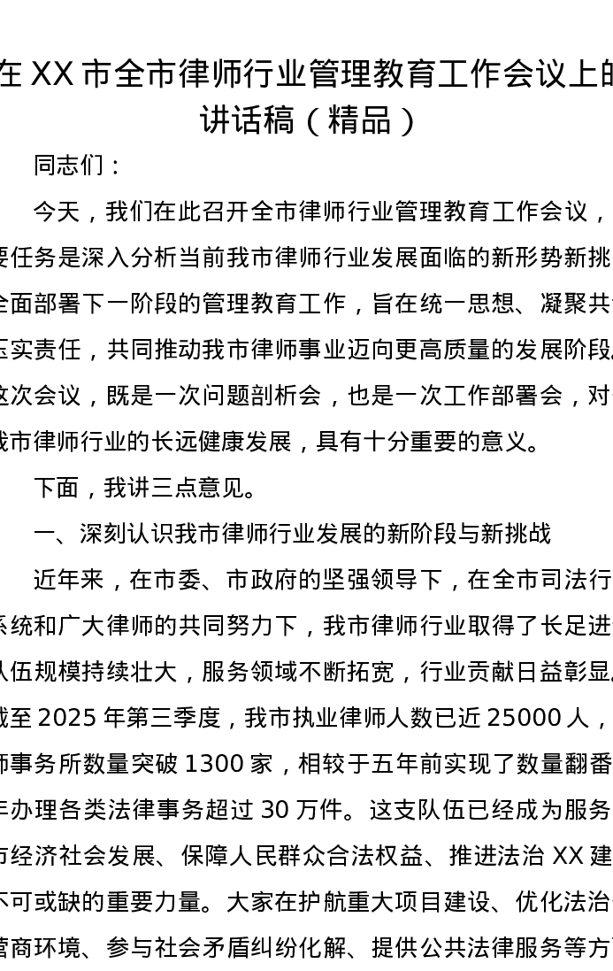 在XX市全市律师行业管理教育工作会议上的讲话稿(精品)