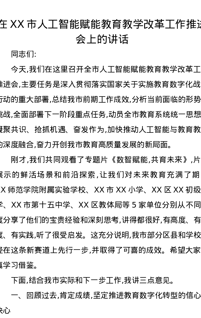 在XX市人工智能赋能教育教学改革工作推进会上的讲话