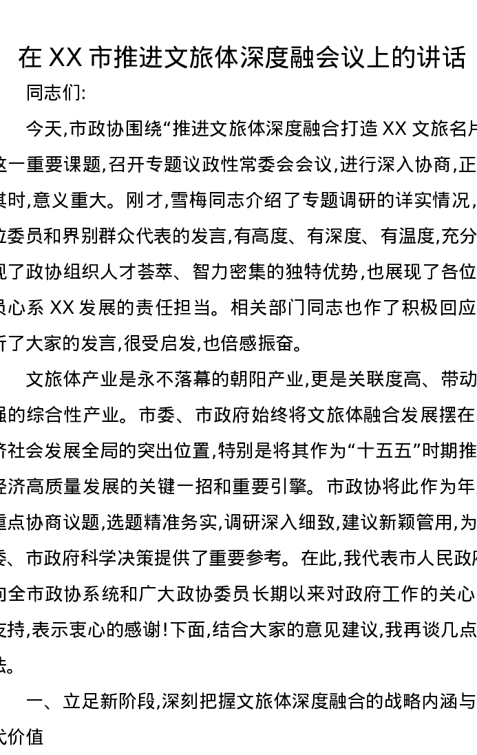 在XX市推进文旅体深度融会议上的讲话