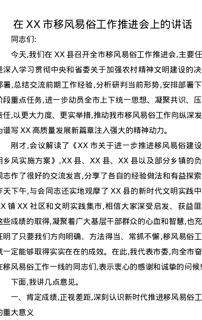 在XX市移风易俗工作推进会上的讲话