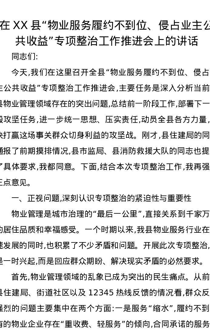 在XX县“物业服务履约不到位、侵占业主公共收益”专项整治工作推进会上的讲话