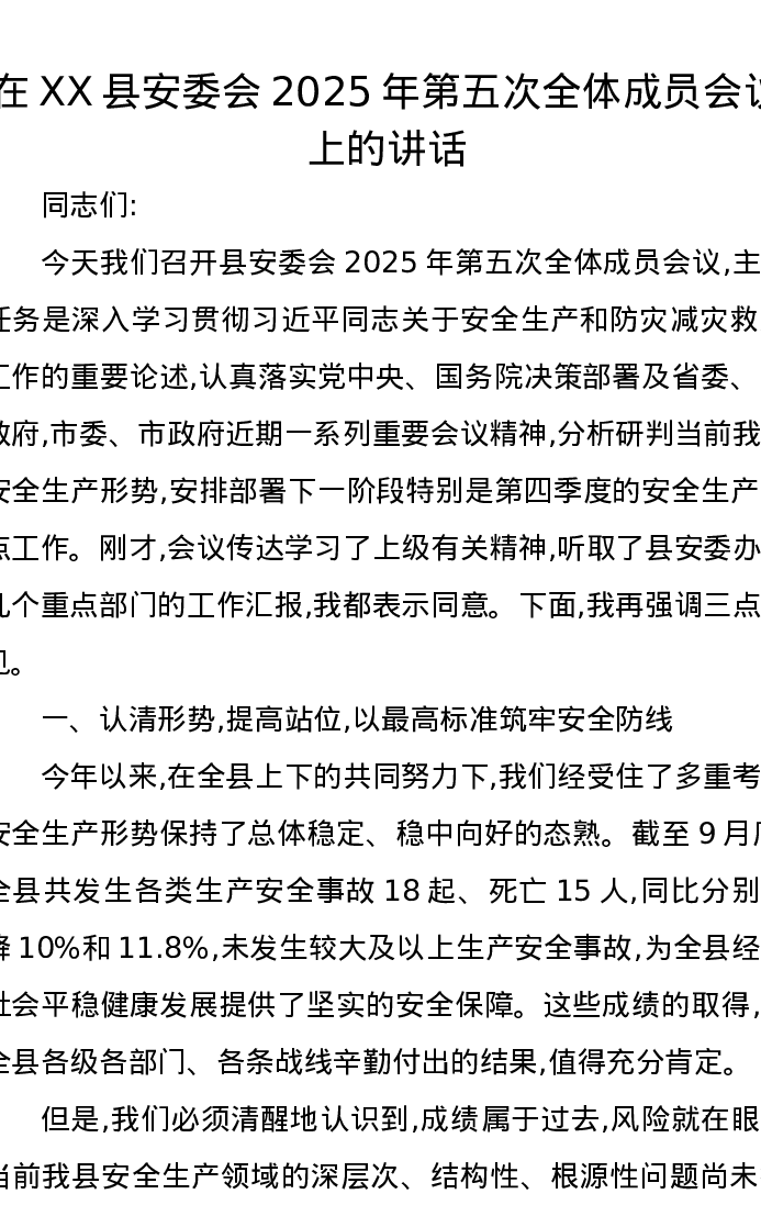 在XX县安委会2025年第五次全体成员会议上的讲话