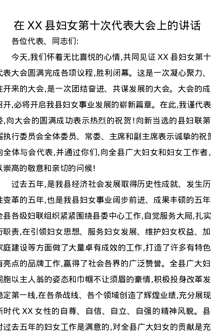 在XX县妇女第十次代表大会上的讲话
