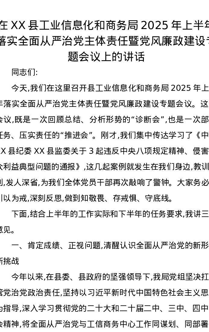 在XX县工业信息化和商务局2025年上半年落实全面从严治党主体责任暨党风廉政建设专题会议上的讲话