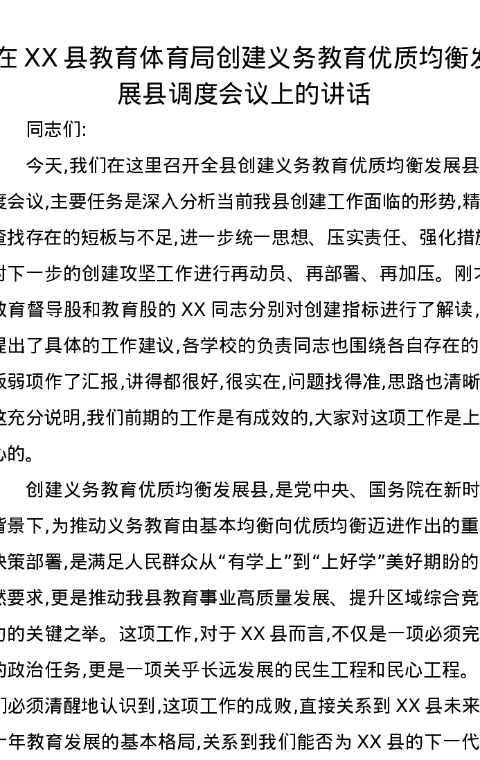 在XX县教育体育局创建义务教育优质均衡发展县调度会议上的讲话