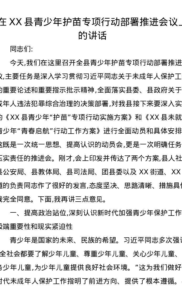 在XX县青少年护苗专项行动部署推进会议上的讲话