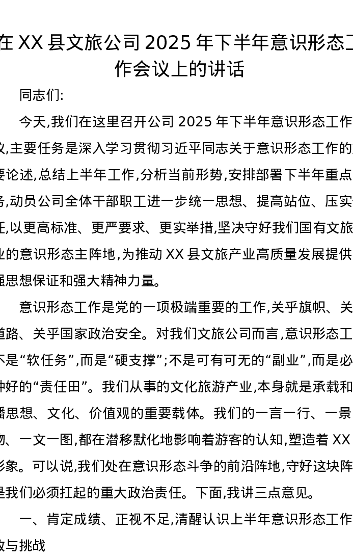 在XX县文旅公司2025年下半年意识形态工作会议上的讲话
