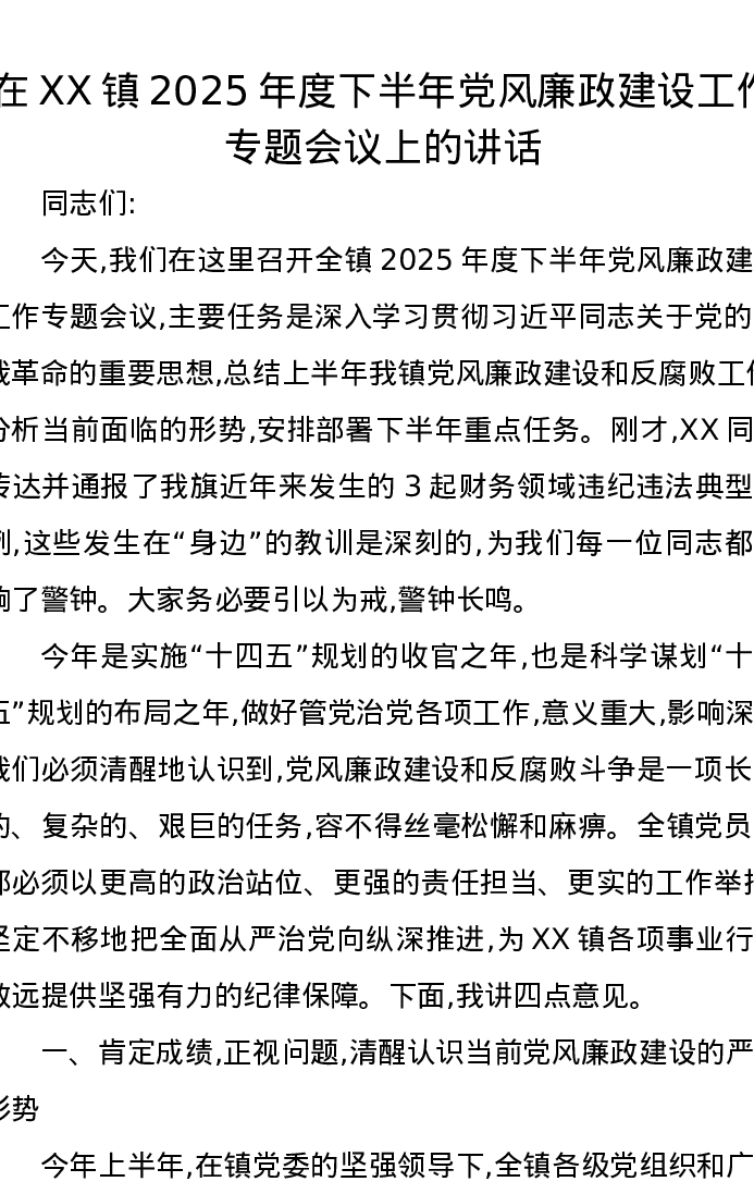 在XX镇2025年度下半年党风廉政建设工作专题会议上的讲话