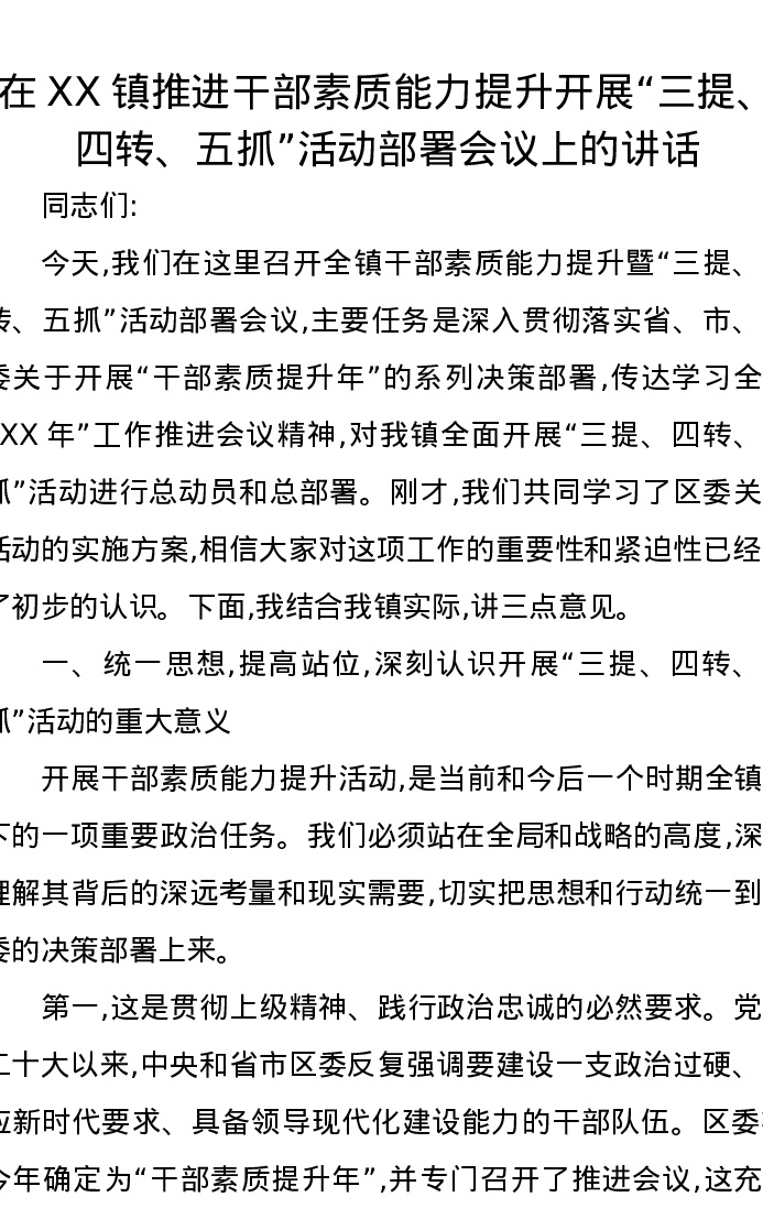 在XX镇推进干部素质能力提升开展“三提、四转、五抓”活动部署会议上的讲话