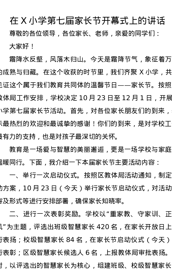 在X小学第七届家长节开幕式上的讲话