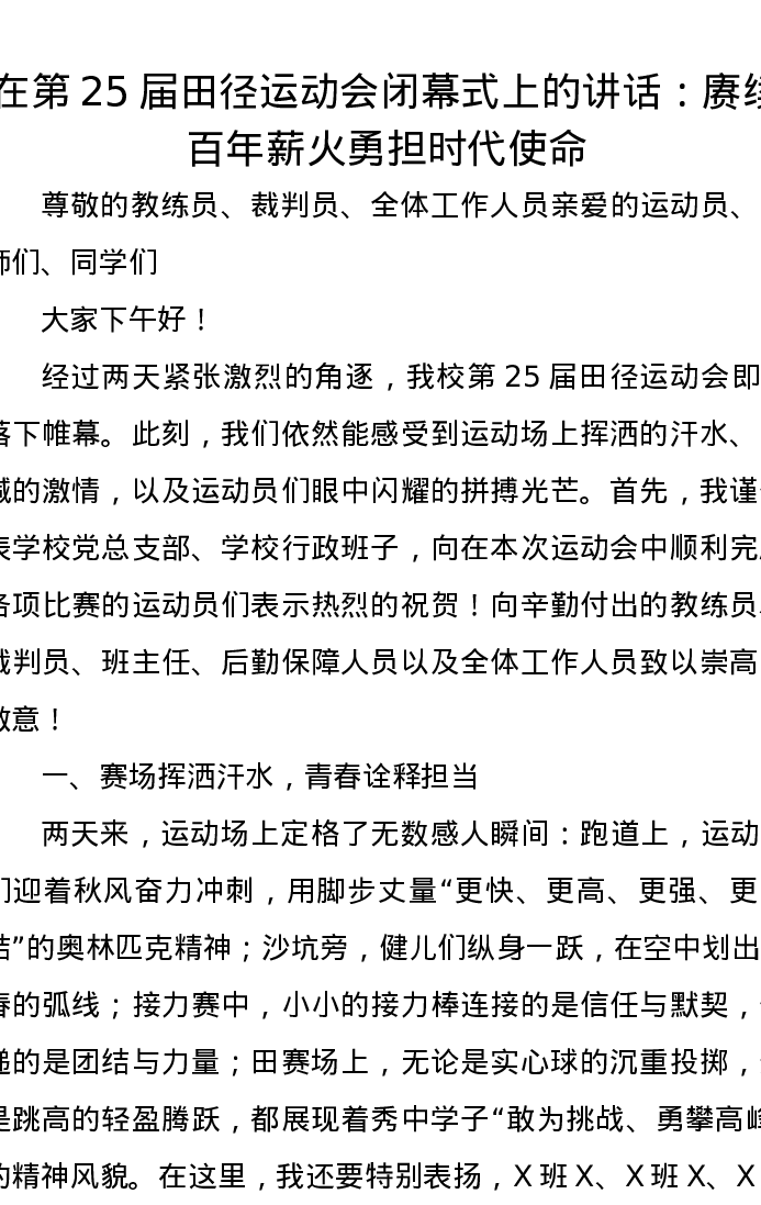 在第25届田径运动会闭幕式上的讲话:赓续百年薪火勇担时代使命