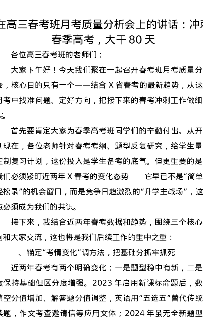 在高三春考班月考质量分析会上的讲话:冲刺春季高考,大干80天