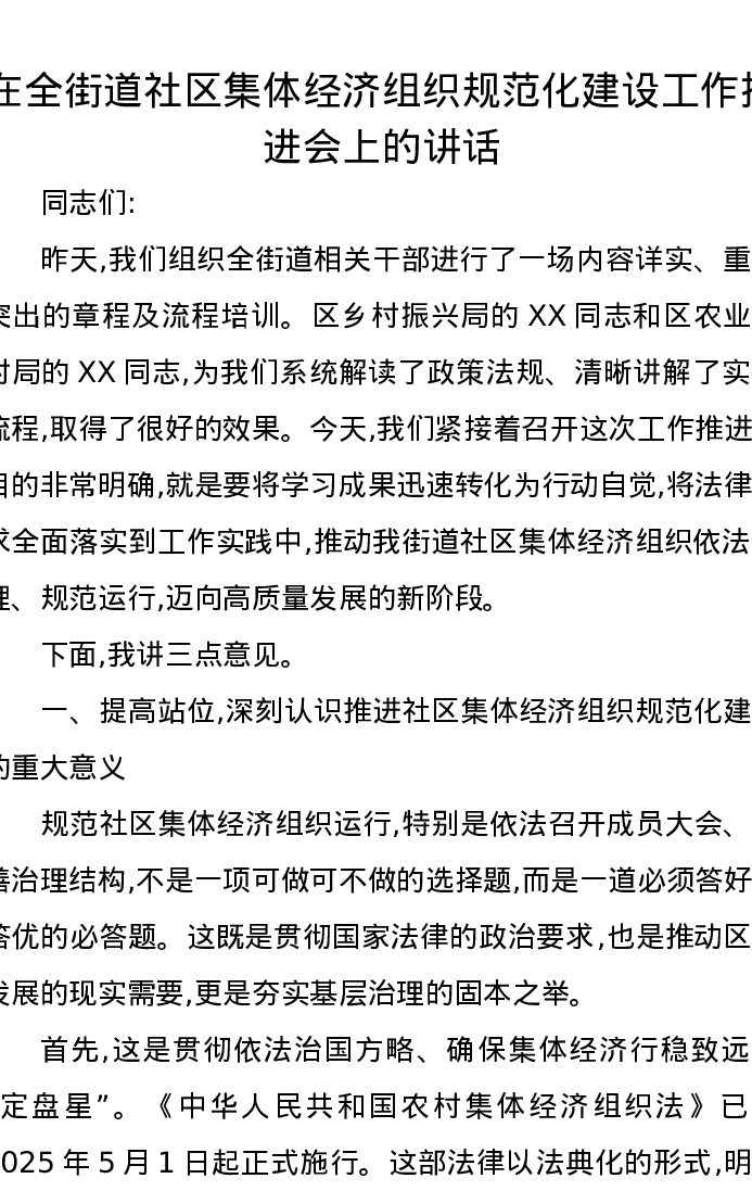 在全街道社区集体经济组织规范化建设工作推进会上的讲话