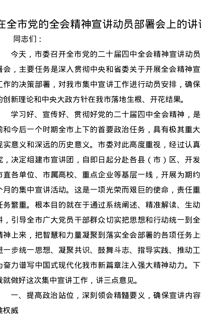 在全市党的二十届四中全会精神宣讲动员部署会上的讲话