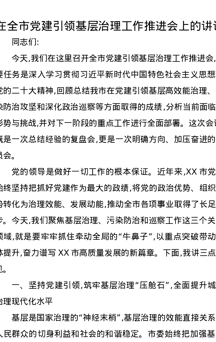在全市党建引领基层治理工作推进会上的讲话