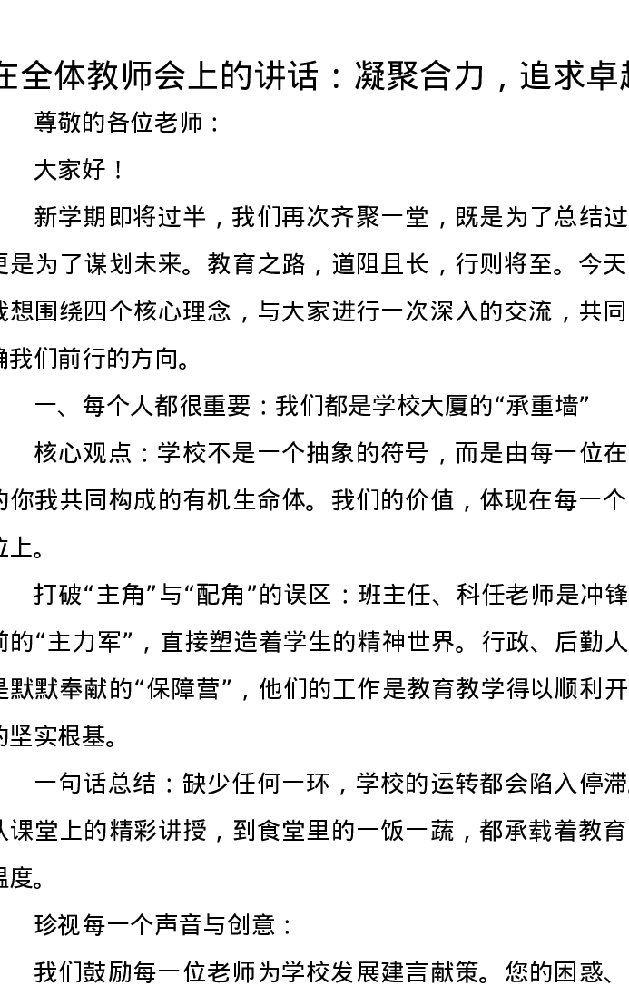 在全体教师会上的讲话:凝聚合力,追求卓越