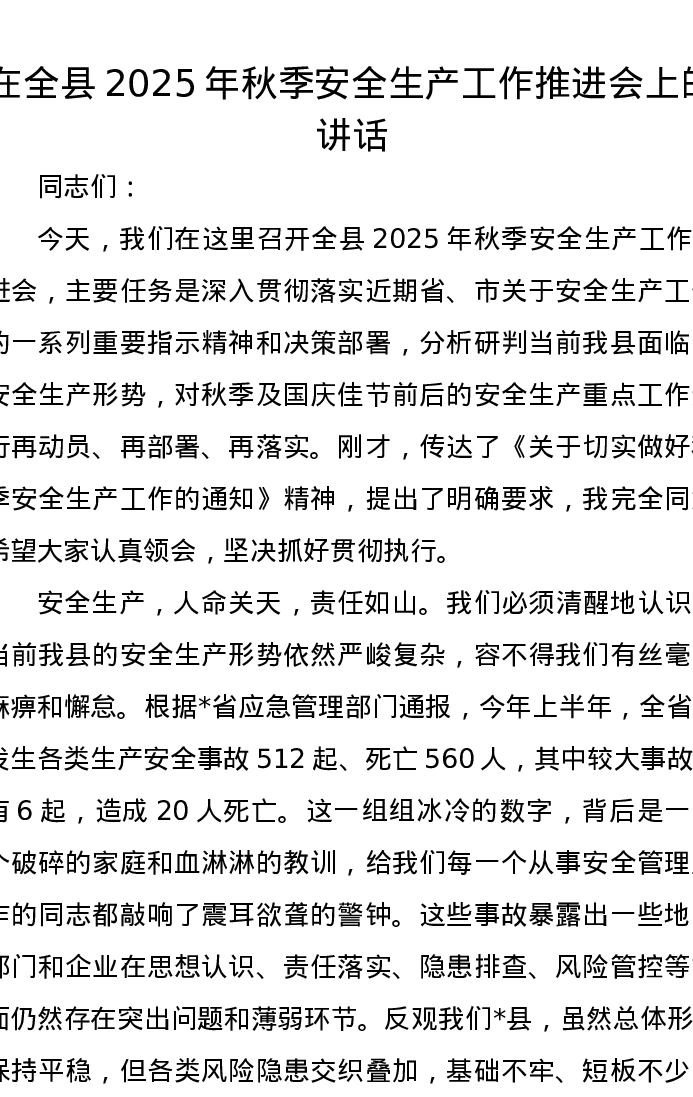 在全县2025年秋季安全生产工作推进会上的讲话