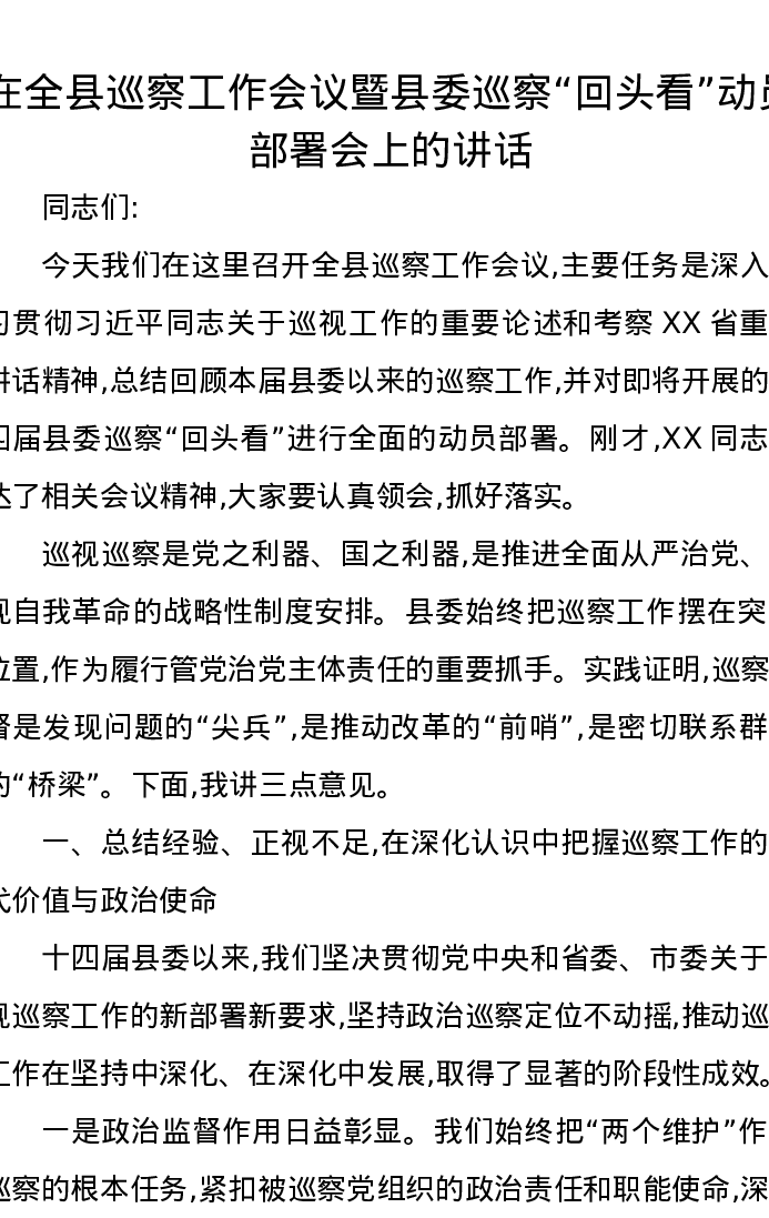 在全县巡察工作会议暨县委巡察“回头看”动员部署会上的讲话