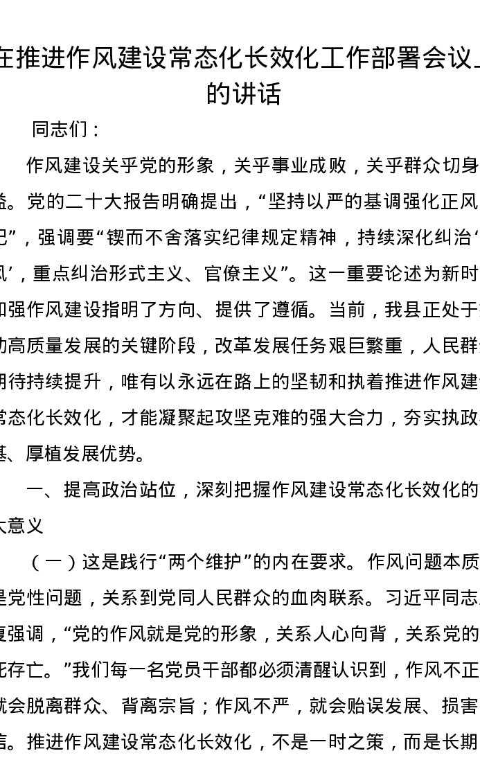 在推进作风建设常态化长效化工作部署会议上的讲话