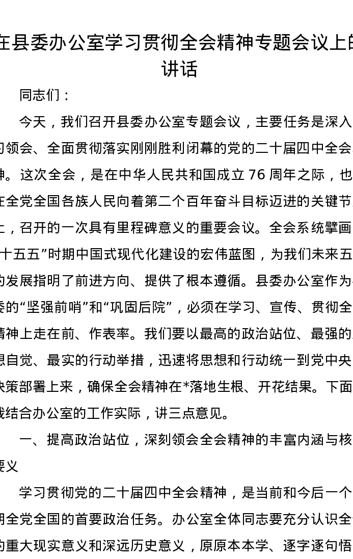在县委办公室学习贯彻二十届四中全会精神专题会议上的讲话