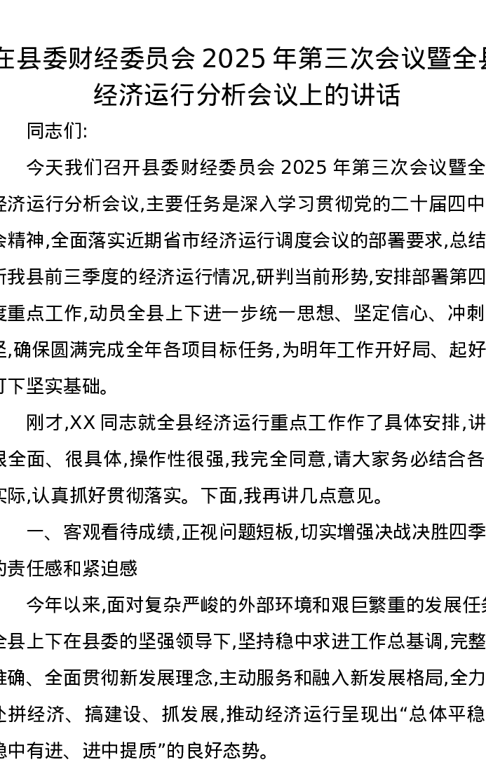 在县委财经委员会2025年第三次会议暨全县经济运行分析会议上的讲话