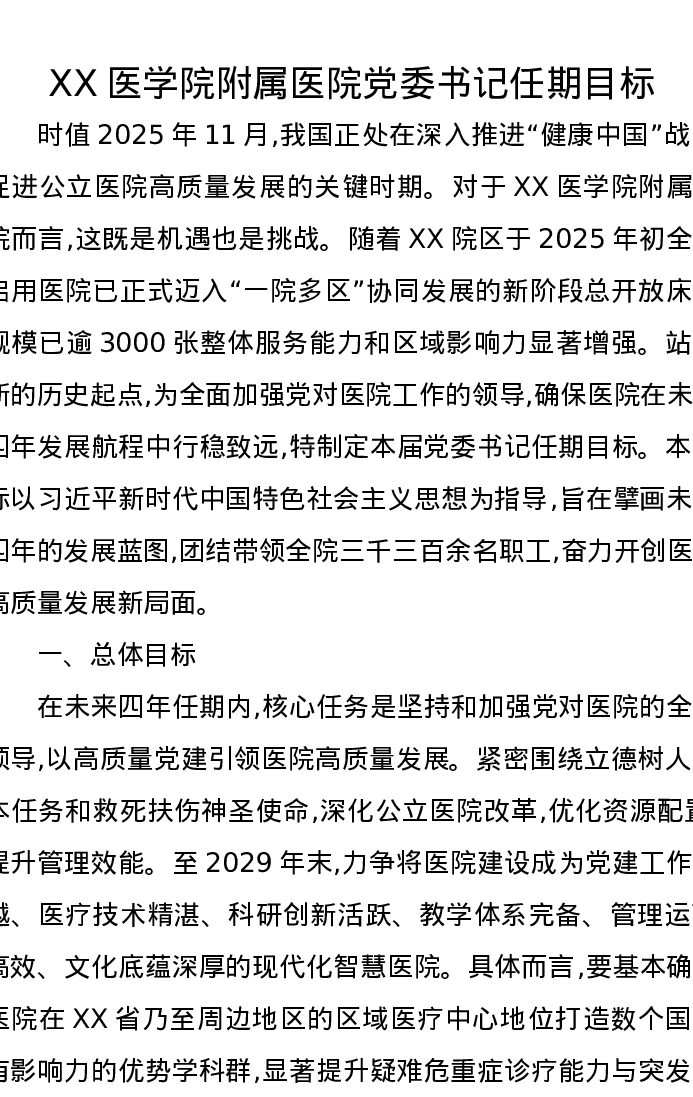 XX医学院附属医院党委书记任期目标
