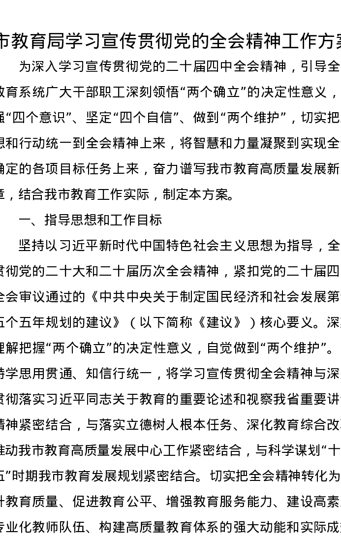 市教育局学习宣传贯彻党的二十届四中全会精神工作方案