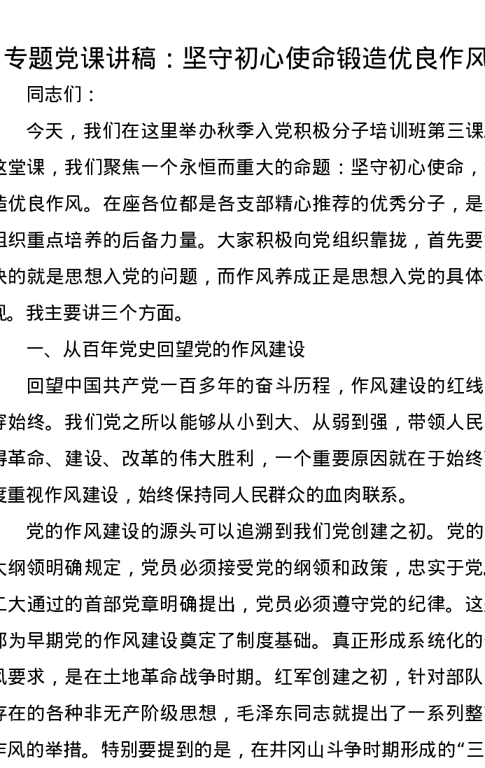专题党课讲稿:坚守初心使命 锻造优良作风