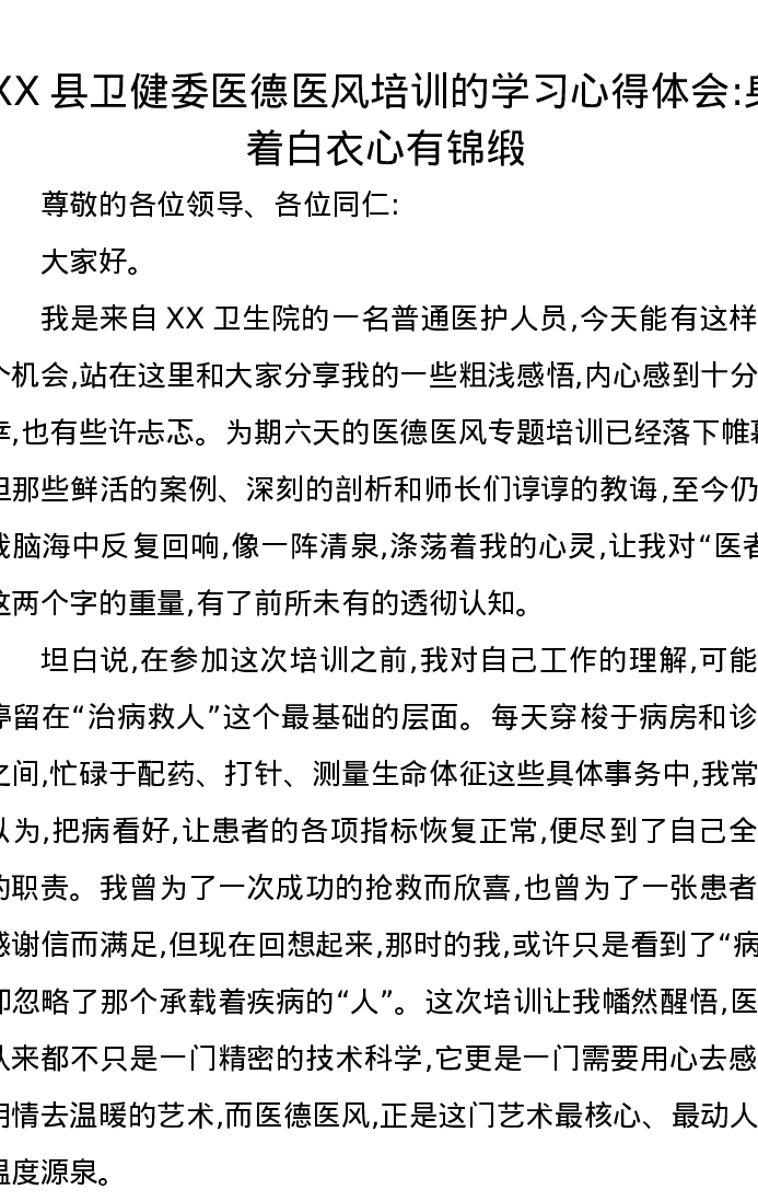 XX县卫健委医德医风培训的学习心得体会:身着白衣心有锦缎