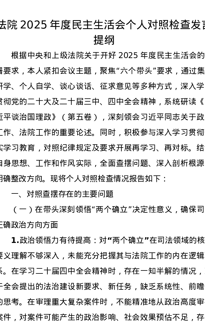 法院2025年度xxxxx个人对照检查发言提纲