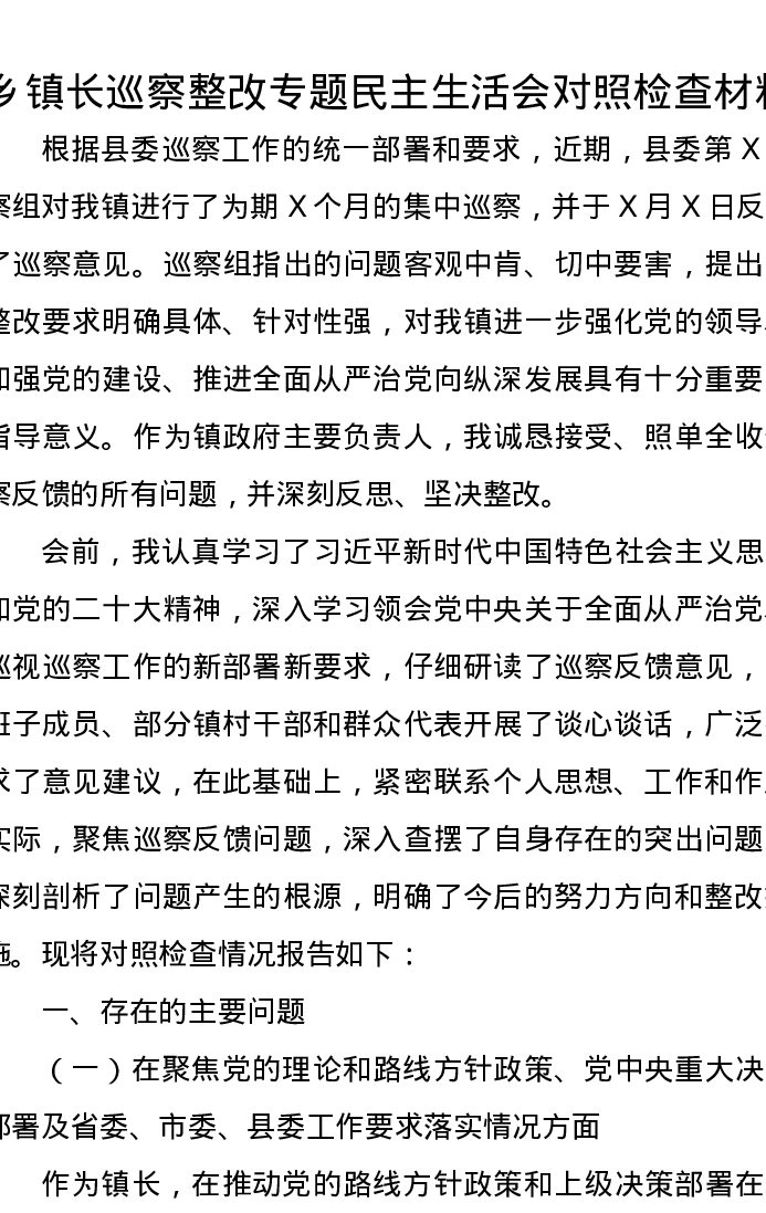 乡镇长巡察整改专题xxxxx对照检查材料