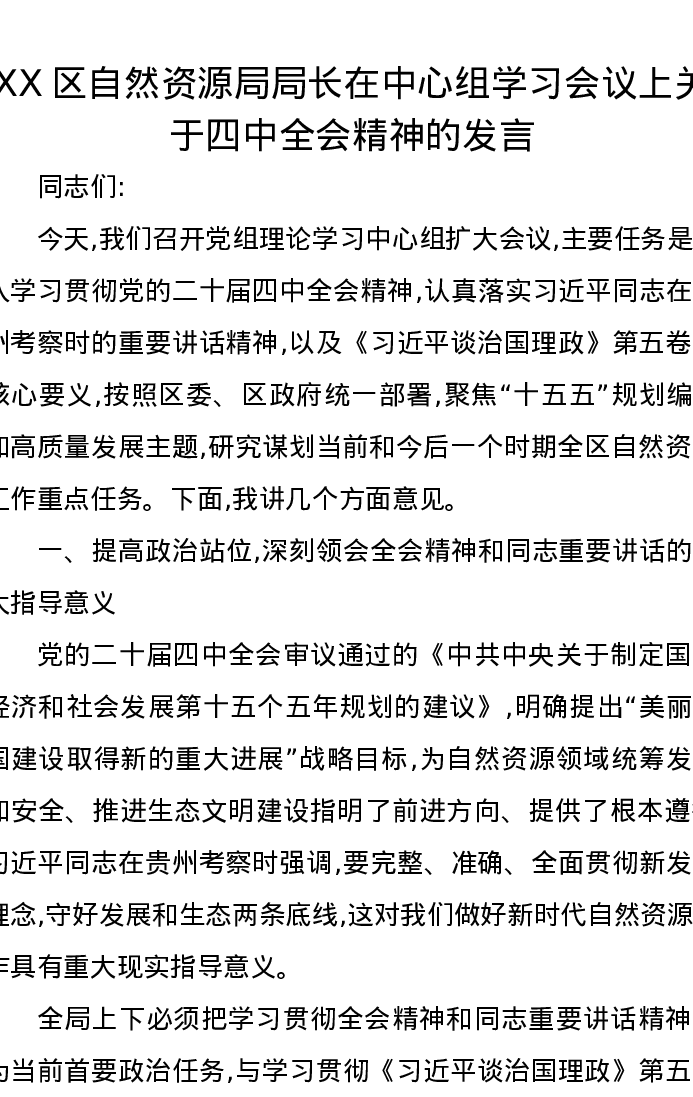 XX区自然资源局局长在中心组学习会议上关于二十届四中全会精神的发言