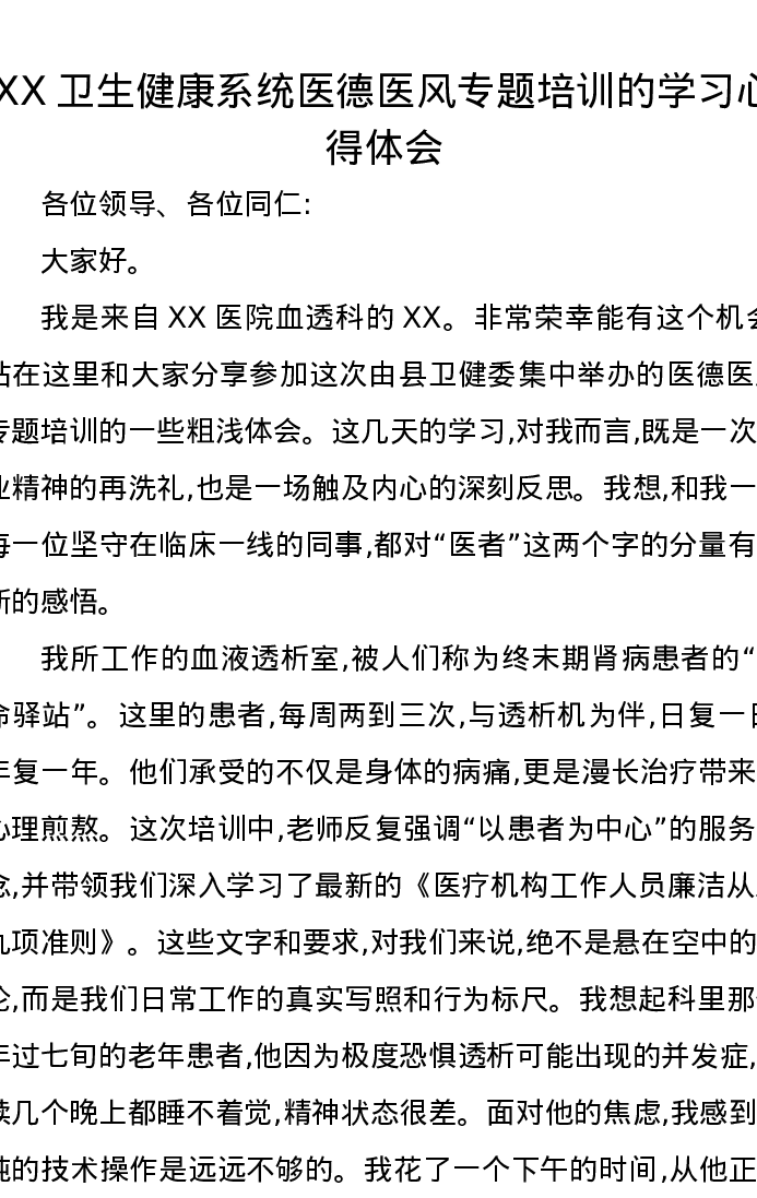 XX卫生健康系统医德医风专题培训的学习心得体会