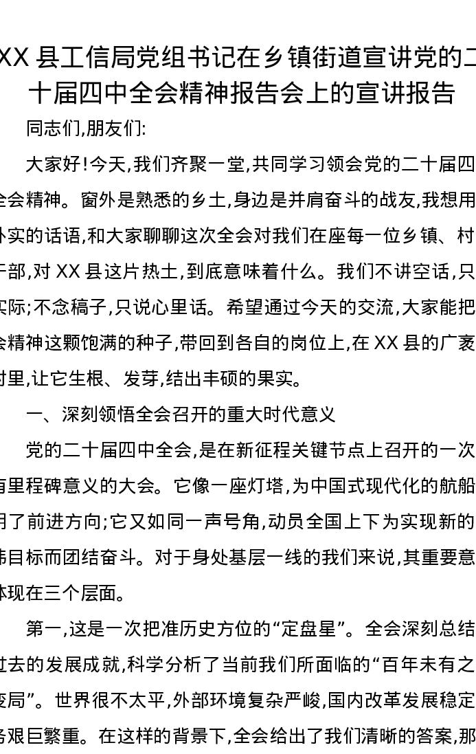 XX县工信局党组书记在乡镇街道宣讲党的二十届四中全会精神报告会上的宣讲报告
