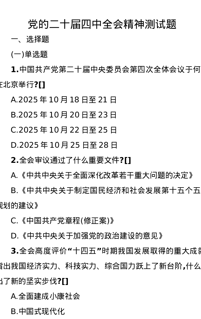 党的二十届四中全会精神测试题