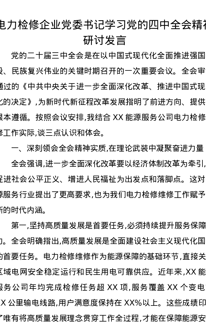 电力检修企业党委书记学习党的二十届四中全会精神研讨发言