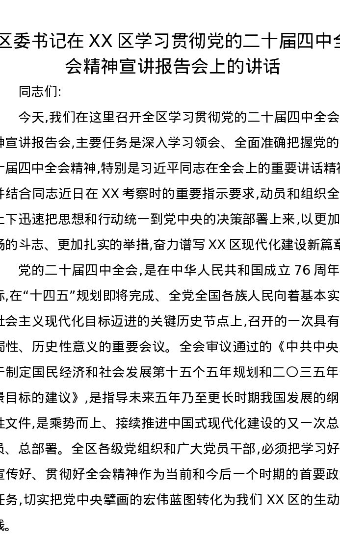 区委书记在XX区学习贯彻党的二十届四中全会精神宣讲报告会上的讲话